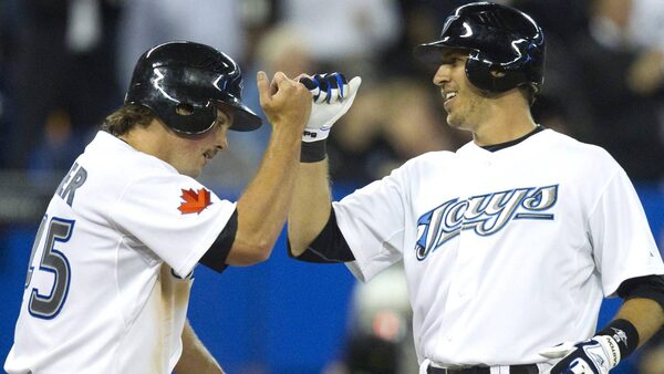 Toronto Blue Jays batter J.P. Arencibia celebrates his two-run home run with Travis Snider (L) during the fourth inning of their MLB American League baseball game against the Minnesota Twins in Toronto April 1, 2011. REUTERS/ Fred ThornhillFRED THORNHILL/Reuters