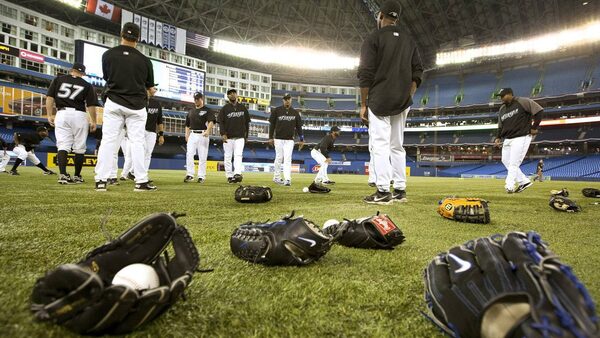 Baseball gloves litter the field as the Toronto Blue Jays participate in the team's first workout at the Roger Centre in Toronto Thursday, 31, 2011. The Blue Jays open up their 2011 season against the Minnesota Twins at the Rogers Centre Friday, April 1. THE CANADIAN PRESS/Darren CalabreseDarren Calabrese/The Canadian Press