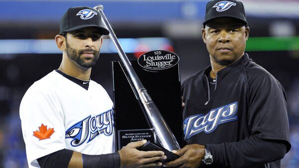 Toronto Blue Jays' Jose Bautista is presented with the Silver Slugger Award by Blue Jays hitting coach Dwayne Murphy (R) before their MLB American League baseball game against the Minnesota Twins in Toronto April 1, 2011. REUTERS/ Mike CasseseMIKE CASSESE/Reuters