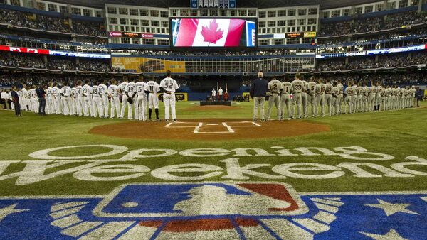 The Toronto Blue Jays and Minnesota Twins line up for the national anthems prior to AL action in Toronto on Friday, April 1, 2011. THE CANADIAN PRESS/Nathan DenetteNathan Denette/The Canadian Press