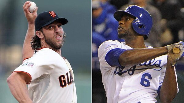 San Francisco Giants starting pitcher Madison Bumgarner and Kansas City Royals center fielder Lorenzo Cain