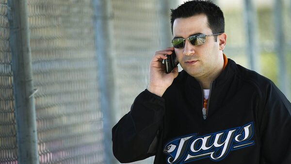 Toronto Blue Jays general manager Alex Anthopoulos talks on his cell phone during baseball spring training in Dunedin, FL, on Wednesday, Feb. 16, 2011.Nathan Denette