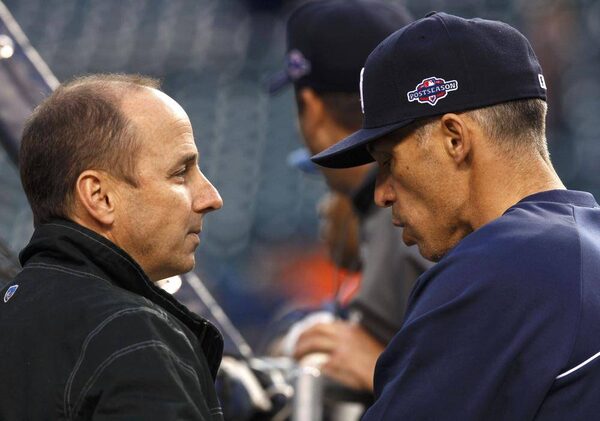 New York Yankees manager Joe Girardi (R) talks with Yankees general manager Brian Cashman during battling practice prior to Game 4 of the ALCS against the Detroit Tigers in Detroit, Michigan, October 17, 2012.JESSICA RINALDI/Reuters
