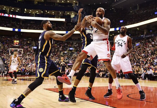 Toronto Raptors forward P.J. Tucker (2) grabs a rebound in front of Indiana Pacers forward Paul George (13) and Pacers centre Myles Turner (33) as Raptors forward Patrick Patterson (54) looks on during second half NBA basketball action, in Toronto on Sunday, March 19, 2017.Frank Gunn/The Canadian Press