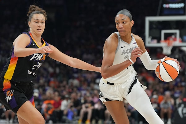 Las Vegas Aces centre A'ja Wilson (22) drives on Phoenix Mercury forward Kathryn Westbeld (24) during Game 4 of the 2025 WNBA finals last October in Phoenix.Rick Scuteri/The Associated Press