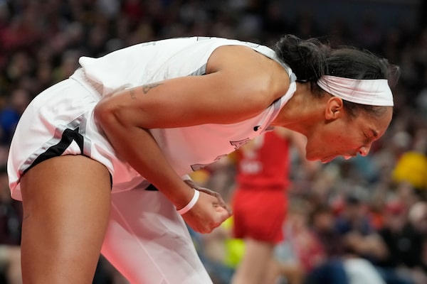 Las Vegas Aces' A'ja Wilson reacts after missing a shot during the second half of a WNBA basketball game against the Indiana Fever on Sept. 11, 2024, in Indianapolis.Darron Cummings/The Associated Press