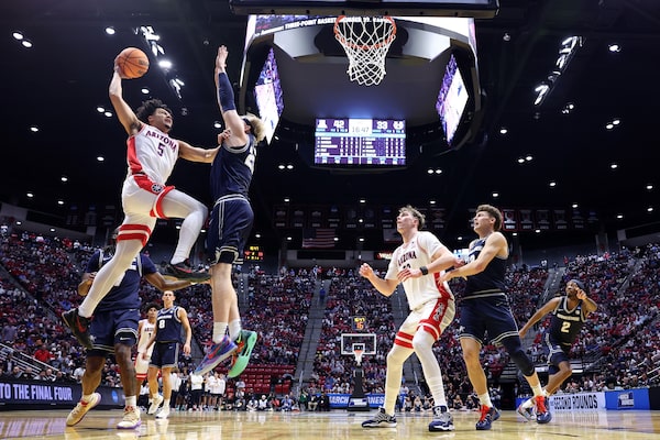Brayden Burries (5) of the Arizona Wildcats goes to the basket against Karson Templin (22) of the Utah State Aggies during their second round game in the NCAA men's basketball tournament at Viejas Arena at San Diego State University on Sunday in San Diego.Sean M. Haffey/Getty Images