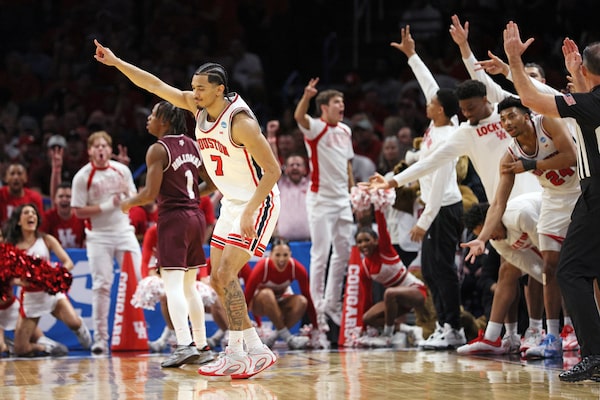 Houston guard Milos Uzan (7) reacts after making a three-point basket against Texas A&M during their second round game of the NCAA tournament on Saturday in Oklahoma City.Nate Billings/The Associated Press