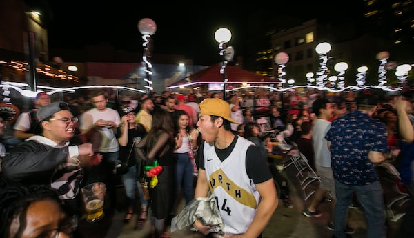 As many as 20,000 fans celebrate the Raptors Game 4 victory over Golden State in the NBA Finals at Celebration Square in Mississauga on June 7, 2019.J.P. MOCZULSKI/The Globe and Mail