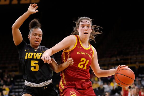 Iowa State guard Bridget Carleton drives past Iowa guard Alexis Sevillian during the first half of an NCAA college basketball game, in Iowa City, Iowa, on Dec. 5, 2018.Charlie Neibergall/The Associated Press