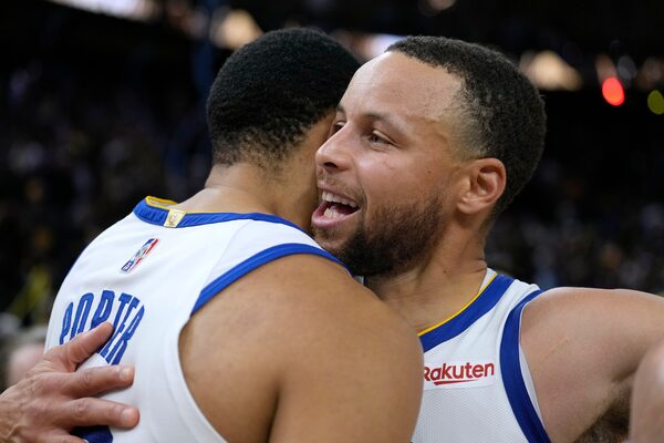 Golden State Warriors' Stephen Curry, right, hugs Otto Porter Jr. after a 101-98 victory against the Memphis Grizzlies during the second half of Game 4 of an NBA basketball Western Conference playoff semi-final in San Francisco on May 9, 2022.Tony Avelar/The Associated Press