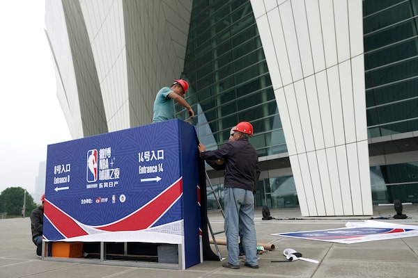 Workers dismantle signage for an NBA fan event scheduled to be held on Wednesday night at the Shanghai Oriental Sports Center in Shanghai, China, on Oct. 8, 2019.The Associated Press