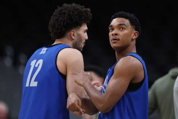 Caleb Foster (right) of the Duke Blue Devils looks on during a practice session ahead of the Sweet 16 in the East Regional of the NCAA men's basketball tournament at Capital One Arena on Thursday in Washington, DC.Patrick Smith/Getty Images