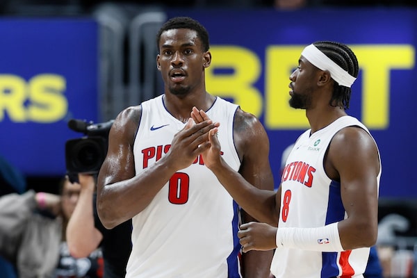 Detroit Pistons center Jalen Duren (0) celebrates with guard Caris LeVert (8) after a win over the Toronto Raptors in an NBA basketball game Tuesday, March 31, 2026, in Detroit. (AP Photo/Duane Burleson)Duane Burleson/The Associated Press