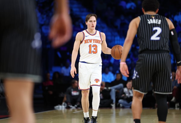New York Knicks guard Tyler Kolek (13) surveys the Orlando Magic's defence during the NBA Cup semi-final on Saturday.Ronda Churchill/The Associated Press