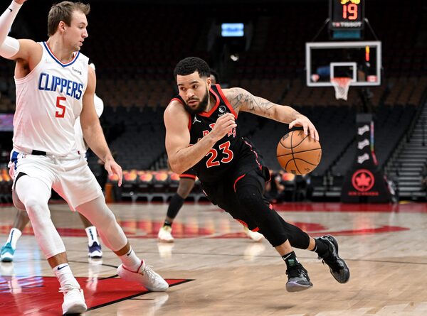 Toronto Raptors guard Fred VanVleet (23) dribbles the ball past Los Angeles Clippers guard Luke Kennard (5) in the first half at Scotiabank Arena in Toronto on Dec. 31, 2021.Dan Hamilton/USA TODAY Sports via Reuters