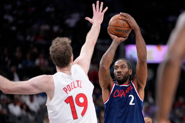 Los Angeles Clippers forward Kawhi Leonard, right, shoots as Toronto Raptors center Jakob Poeltl defends during the first half.Mark J. Terrill/The Associated Press