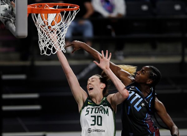 Seattle Storm forward Breanna Stewart scores past Atlanta Dream center Elizabeth Williams during the first half of a WNBA basketball game on June 11, 2021, in College Park, Ga. The Storm beat the Dream 86-75.Ben Margot/The Associated Press