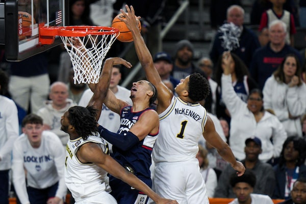 Michigan guard Trey McKenney (1) blocks the shot of UConn forward Jayden Ross, center.AJ Mast/The Associated Press