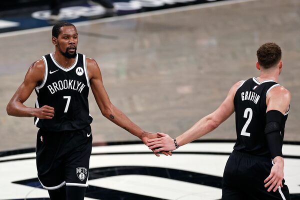 Brooklyn Nets forward Kevin Durant (7) slaps hands with Blake Griffin during the first half of Game 1 of the team's NBA basketball second-round playoff series against the Milwaukee Bucks on June 5, 2021, in New York. The Nets won 115-107.Adam Hunger/The Associated Press