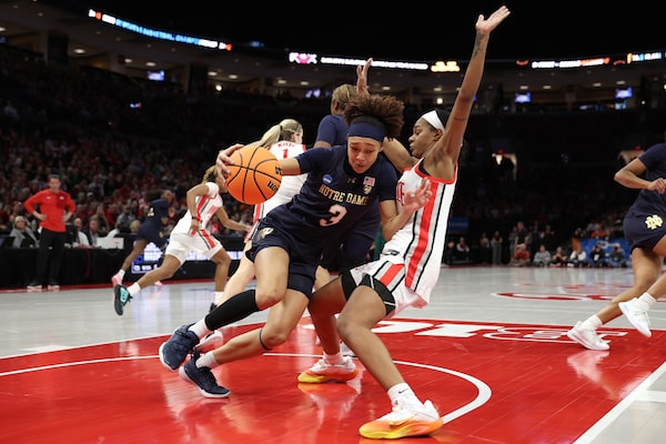 Hannah Hidalgo (3) of the Notre Dame Fighting Irish runs into Kennedy Cambridge (3) of the Ohio State Buckeyes during their second round NCAA women's basketball tournament game at Jerome Schottenstein Center on Monday in Columbus, Ohio.Kirk Irwin/Getty Images