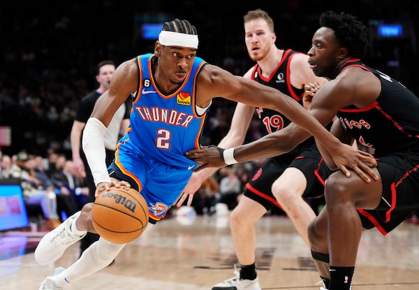 Oklahoma City Thunder guard Shai Gilgeous-Alexander drives at Toronto Raptors forward O.G. Anunoby during the second half in Toronto. The Raptors won 128-111 on March 16, 2023.Frank Gunn