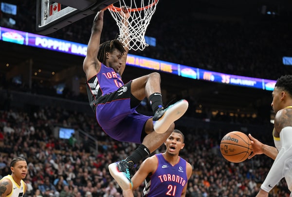 RJ Barrett (rest) of Mississauga, Ont., Jakob Poeltl (rest), Ochai Agbaji (left ankle sprain), Gradey Dick (right knee bone bruise), Jonathan Mogbo (nasal fracture) and Montreal’s Chris Boucher (dental) were some of Toronto’s other regulars who didn’t play.