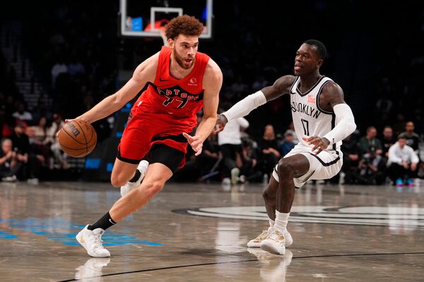 Toronto Raptors forward Jamison Battle (77) dribbles the ball against Brooklyn Nets point guard Dennis Schroder (17) at Barclays Center, Oct. 18, 2024.Gregory Fisher/Reuters