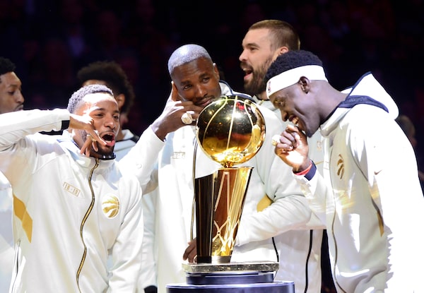 Toronto Raptors players Norman Powell, left to right, Serge Ibaka, Marc Gasol and Pascal Siakam stand with their rings behind the Larry O'Brien NBA Championship Trophy before playing the New Orleans Pelicans in Toronto on Tuesday Oct. 22, 2019.Frank Gunn/The Canadian Press