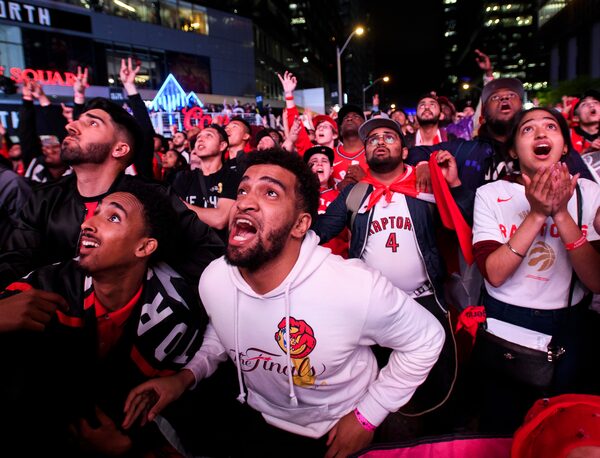 Fans reacts in the final minute of the game in Jurassic Park as the Toronto Raptors defeat the Golden State Warriors during Game 6 of the NBA Finals to win the NBA championship, in Toronto on June 13, 2019.Nathan Denette/The Canadian Press