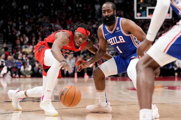 Precious Achiuwa (left) chases down a loose ball under pressure from Philadelphia 76ers guard James Harden.Frank Gunn/The Canadian Press