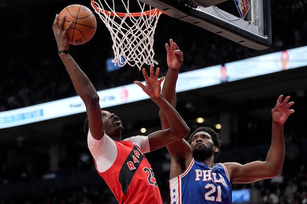 Toronto Raptors forward Chris Boucher attacks the basket as Philadelphia 76ers centre Joel Embiid defends during first half NBA action in Toronto on April 7.Frank Gunn/The Canadian Press