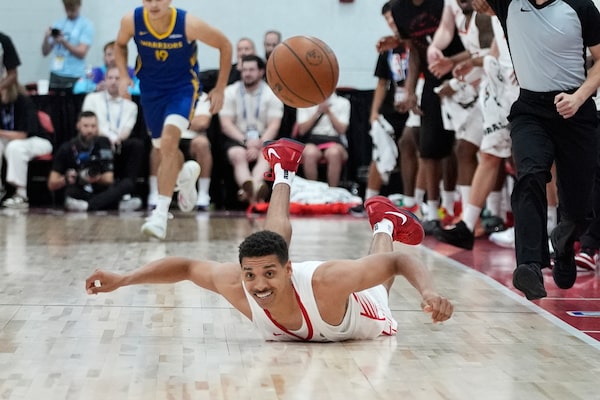 Toronto Raptor Tyreke Key falls to the floor against the Golden State Warriors during 2025 NBA summer league play in Las Vegas.John Locher/The Associated Press