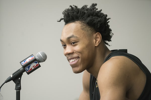 Toronto Raptors' Scottie Barnes talks to reporters at a news conference following a pre-playoff practice at the Ovo Centre in Toronto, on April 15.J.P. MOCZULSKI/THE GLOBE AND MAIL