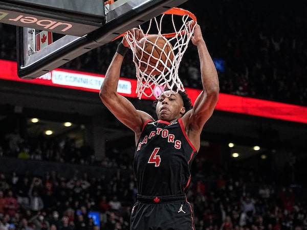 Scottie Barnes dunks the ball against the Houston Rockets at Scotiabank Arena.John E. Sokolowski/USA TODAY Sports via Reuters