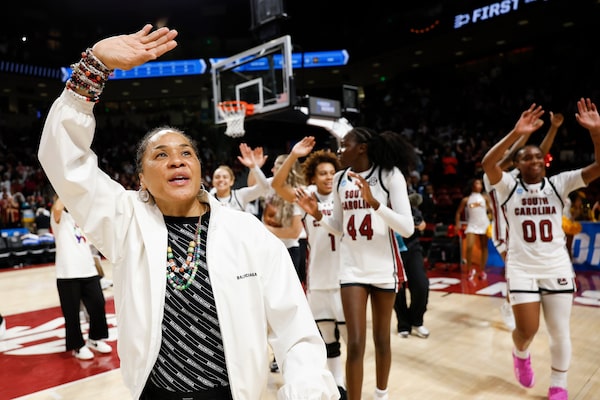 South Carolina head coach Dawn Staley, left, leads her team in waving to supporters after defeating Southern California in the second round of the NCAA college basketball tournament on Monday in Columbia, S.C.Nell Redmond/The Associated Press