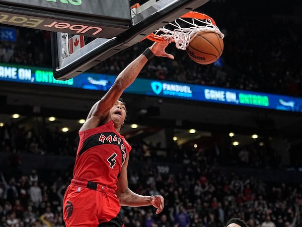 Toronto Raptors forward Scottie Barnes dunks the ball against the Philadelphia 76ers during the second half at Scotiabank Arena. The Raptors won 119-114 on April 7, 2022.John E. Sokolowski/USA TODAY Sports via Reuters