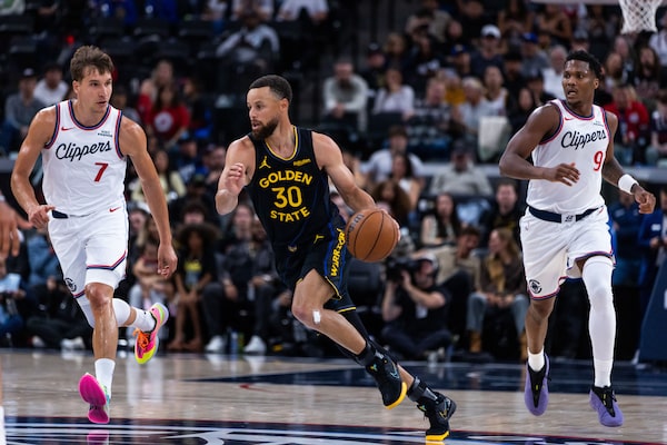 Golden State Warriors guard Stephen Curry (30) drives against Los Angeles Clippers guard Bogdan Bogdanovic (7) during their game on Sunday in Inglewood, Calif.Ethan Swope/The Associated Press