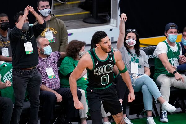 Boston Celtics forward Jayson Tatum and fans celebrate his basket during the second quarter of Game 3 against the Brooklyn Nets on May 28, 2021, in Boston. The Celtics beat the Nets 125-119.Elise Amendola/The Associated Press