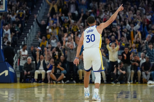 Golden State Warriors guard Stephen Curry celebrates after making a three-point basket during Sunday's game against the Houston Rockets in San Francisco.Godofredo A. Vásquez/The Associated Press