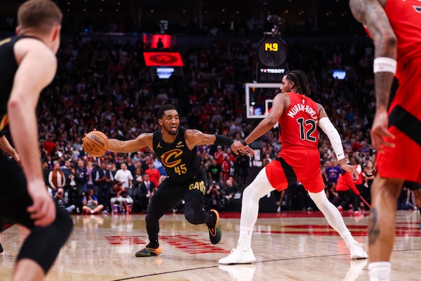With eight seconds left in Sunday’s game and his team going under for the count, Cleveland’s Donovan Mitchell chased his own rebound into the Toronto crowd. He never had a chance at the ball, but he did get two rows deep, ploughing over bodies.