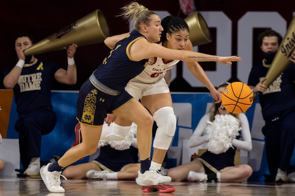 Notre Dame guard Dara Mabrey and Oklahoma guard Skylar Vann, right, fight for the ball in the first half of a second-round game in the NCAA women's college basketball tournament. Notre Dame won 108-64 on March 21, 2022, in Norman, Okla.Mitch Alcala/The Associated Press