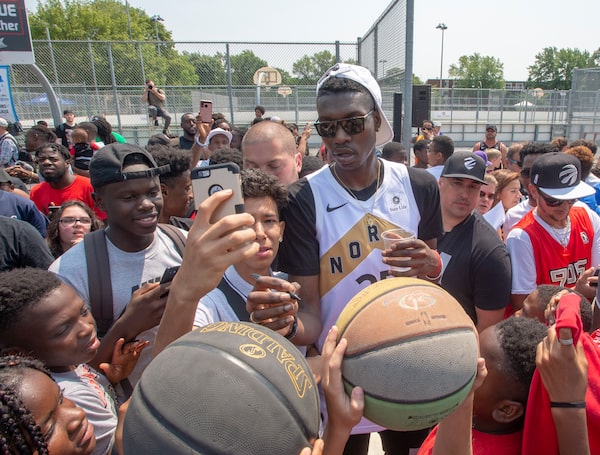 Toronto Raptors' Chris Boucher mingles with fans and signing basketballs during a homecoming visit following the Raptors' NBA championship win over the Golden State Warriors, in Montreal on July 26, 2019.Ryan Remiorz/The Canadian Press