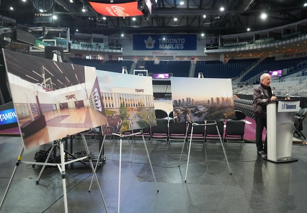 Tempo owner Larry Tanenbaum unveils plans for the team's practice facility at a press conference in Toronto on Friday.Nathan Denette/The Canadian Press