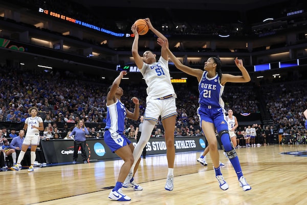 Lauren Betts (51) of the UCLA Bruins takes a shot over Ashlon Jackson (3) and Arianna Roberson (21) of the Duke Blue Devils during the fourth quarter of their Elite Eight game in the NCAA women's basketball tournament at Golden 1 Center on Sunday in Sacramento.Harry How/Getty Images