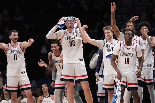 UConn center Donovan Clingan (32) and his teammates reacts in the final seconds of the second half of a second-round college basketball game against Northwestern in the NCAA Tournament, Sunday, March 24, 2024, in New York. UConn won 75-58. (AP Photo/Mary Altaffer)Mary Altaffer/The Associated Press