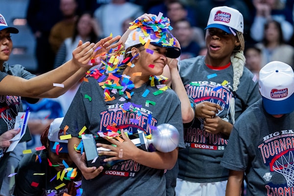 Sarah Strong (centre) of the Connecticut Huskies is announced as the Big East Tournament Most Outstanding Player at Mohegan Sun last week in Uncasville, Conn.Joe Buglewicz/Getty Images