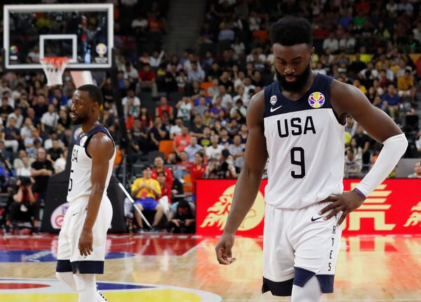Jaylen Brown and Kemba Walker react during the U.S.'s loss to France at the FIBA World Cup in Dongguan, China.KIM KYUNG-HOON/Reuters