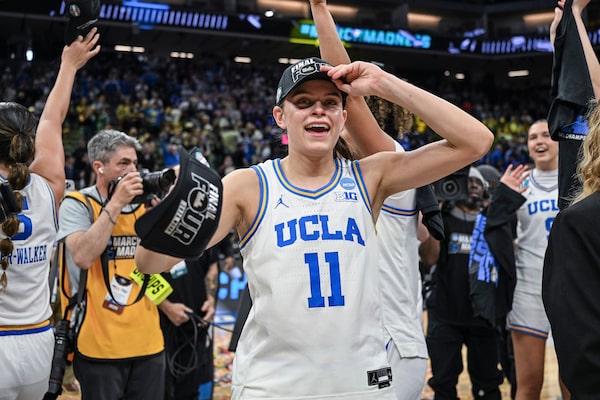 UCLA forward Gabriela Jaquez (11) celebrates after defeating Duke in the Elite Eight of the NCAA college tournament Sunday in Sacramento.Justine Willard/The Associated Press