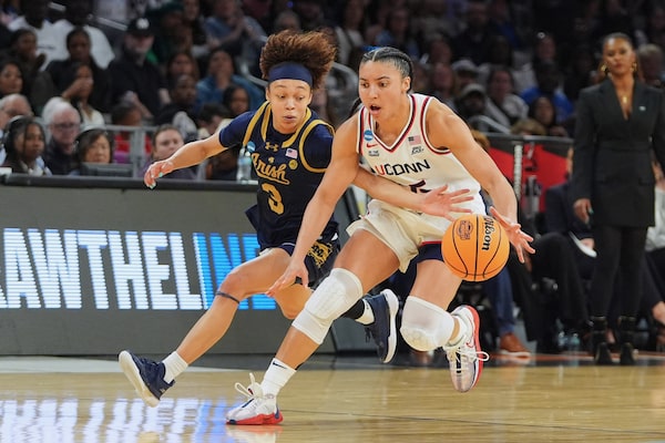 UConn guard Azzi Fudd, right, drives against Notre Dame guard Hannah Hidalgo during the second half of their Elite Eight game in the NCAA college tournament on Sunday in Fort Worth, Tex.LM Otero/The Associated Press